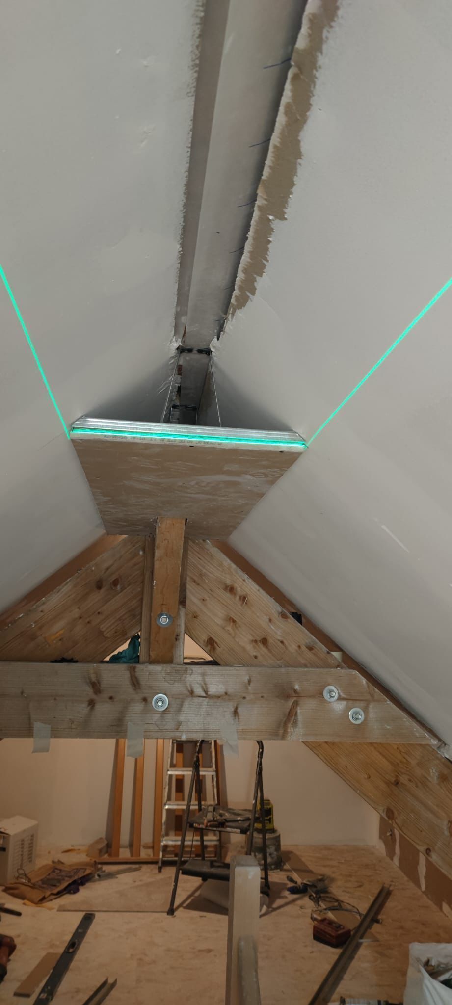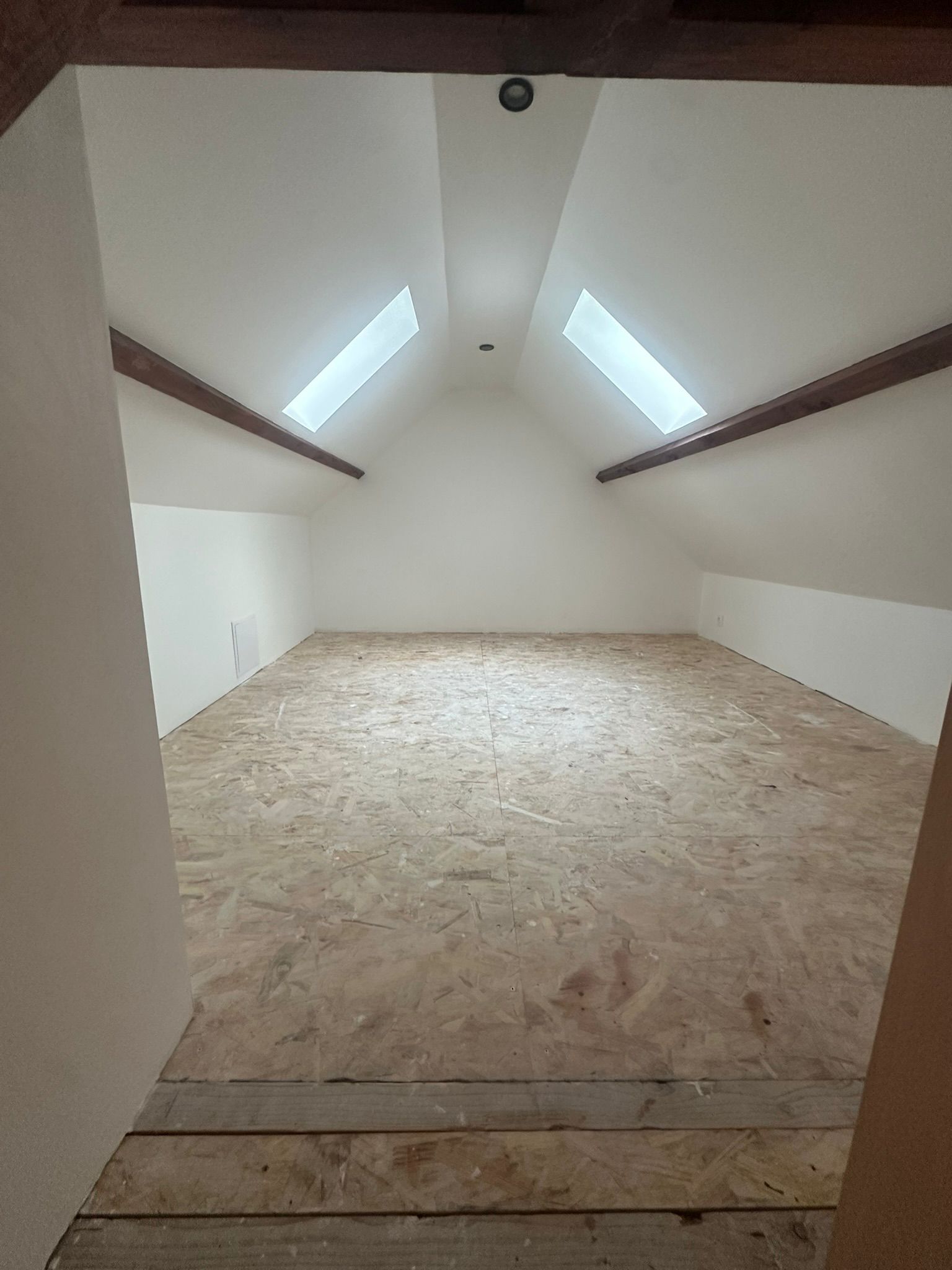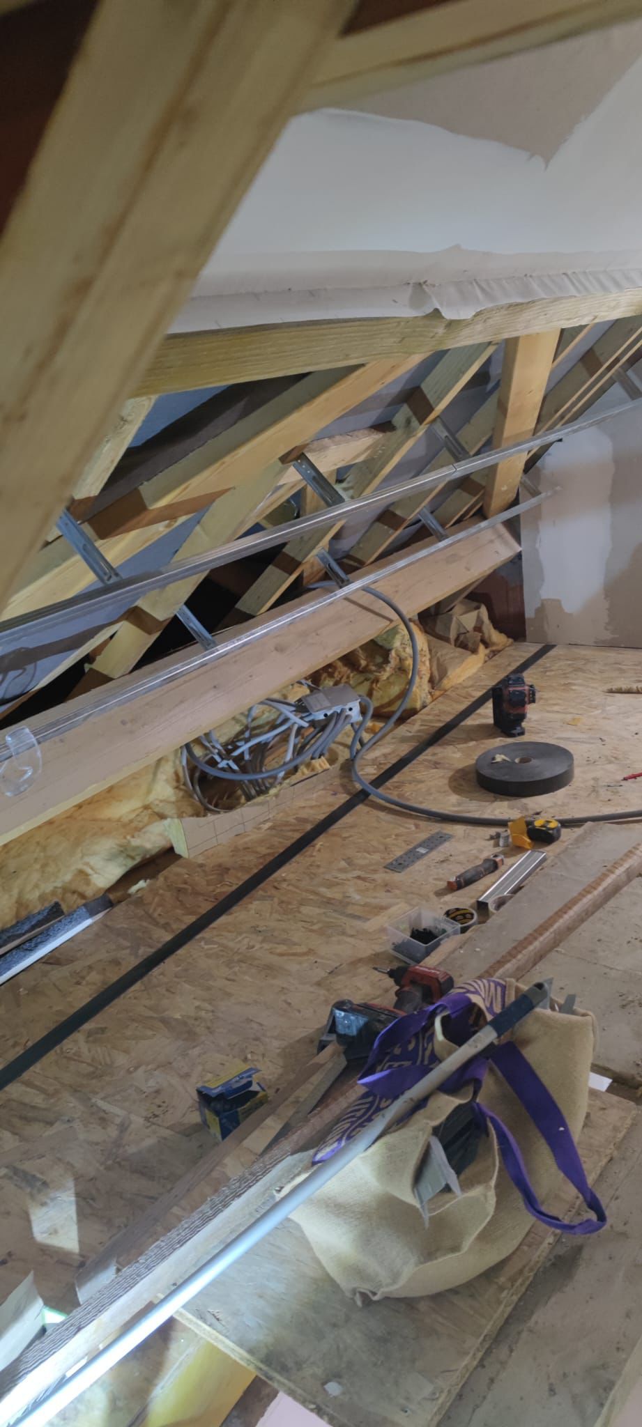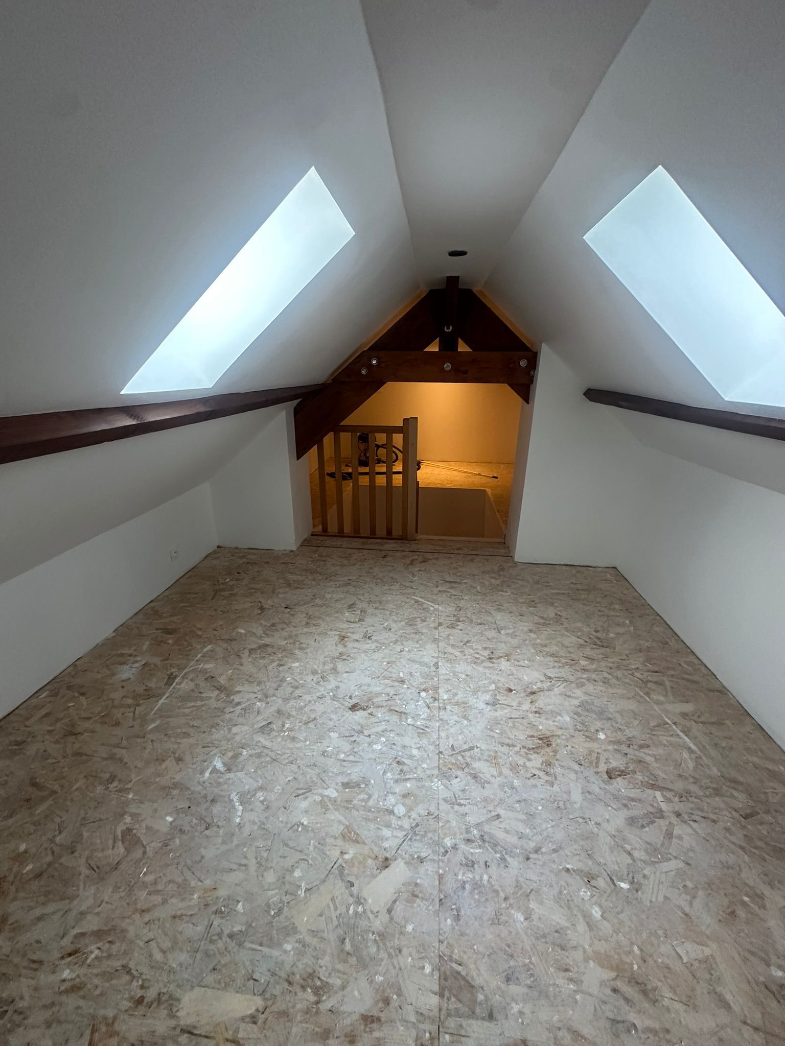 .Renforcement du plancher bas en charpente bois ,installation les fenêtres de toiture, création d'une trémie pour une d'escalier réalisé sur mesure, agencement en ba13 et isolation sous toiture laine de verre 200mm ISOVER, déplacement des pieuvres électriques et moteur vmc, ESCALIER SUR MESURE