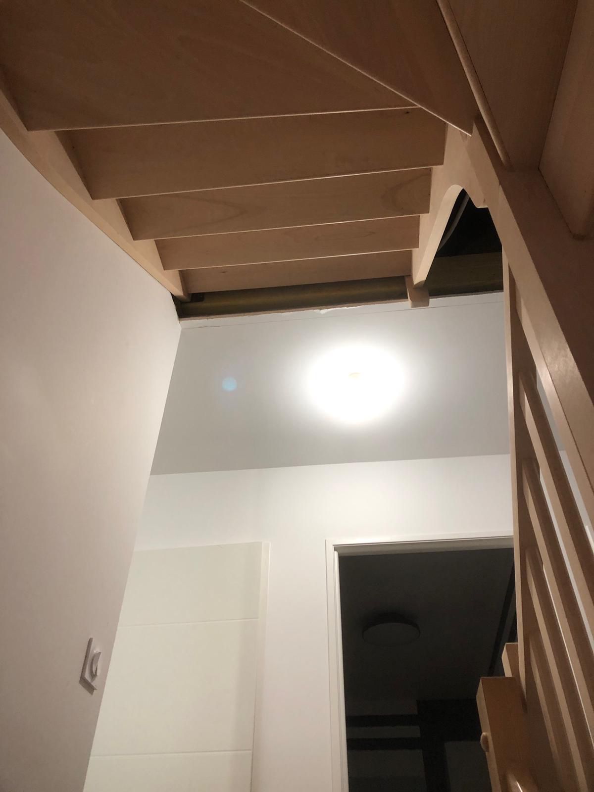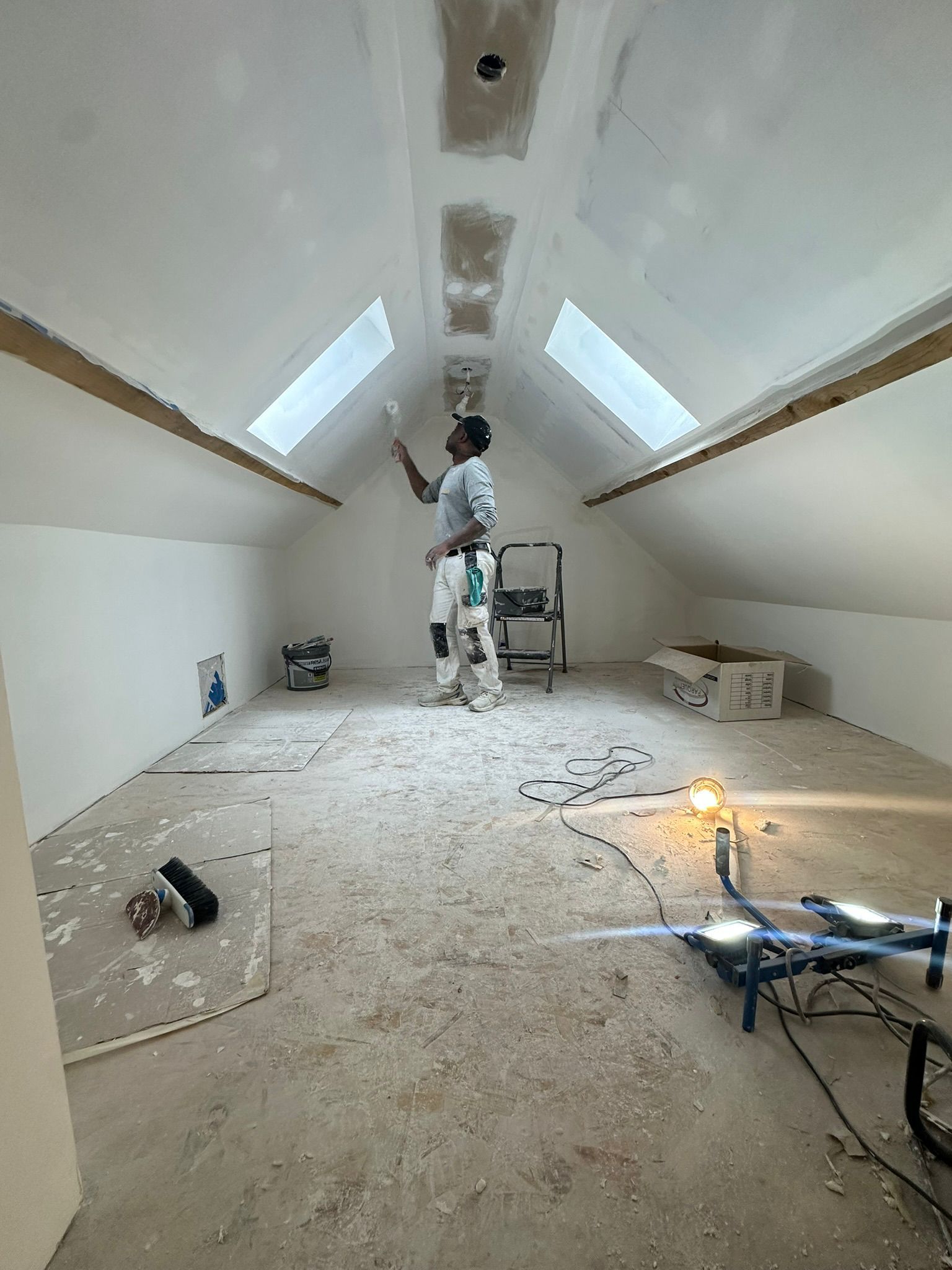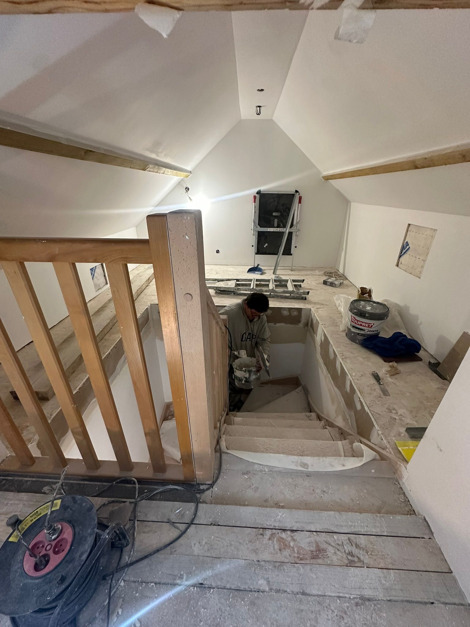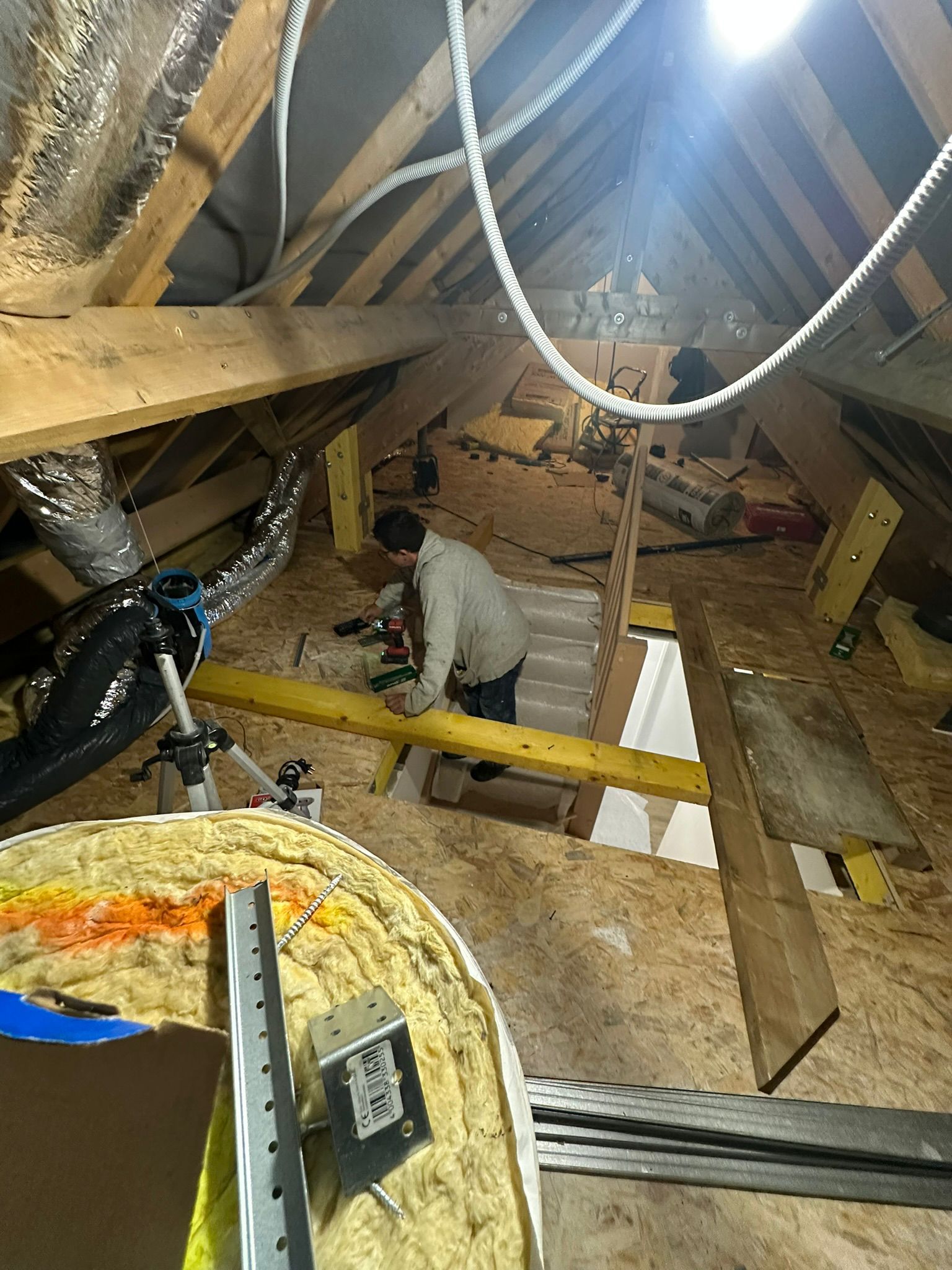 .Renforcement du plancher bas en charpente bois ,installation les fenêtres de toiture, création d'une trémie pour une d'escalier réalisé sur mesure, agencement en ba13 et isolation sous toiture laine de verre 200mm ISOVER, déplacement des pieuvres électriques et moteur vmc, ESCALIER SUR MESURE