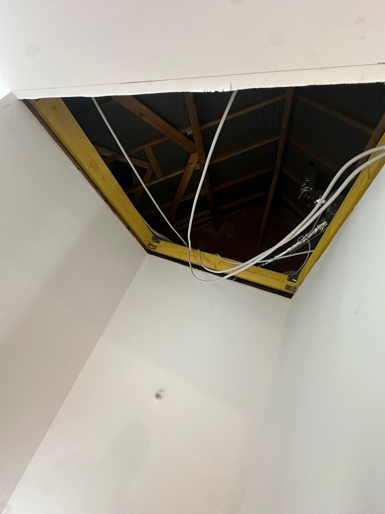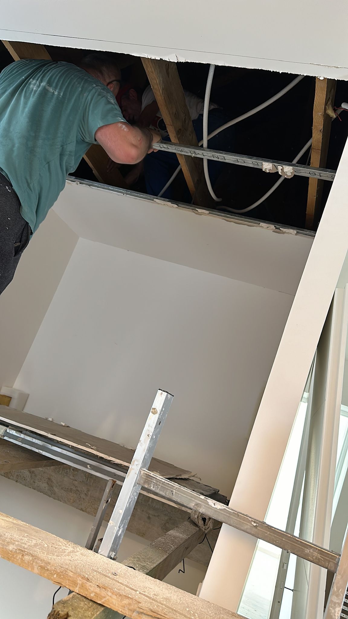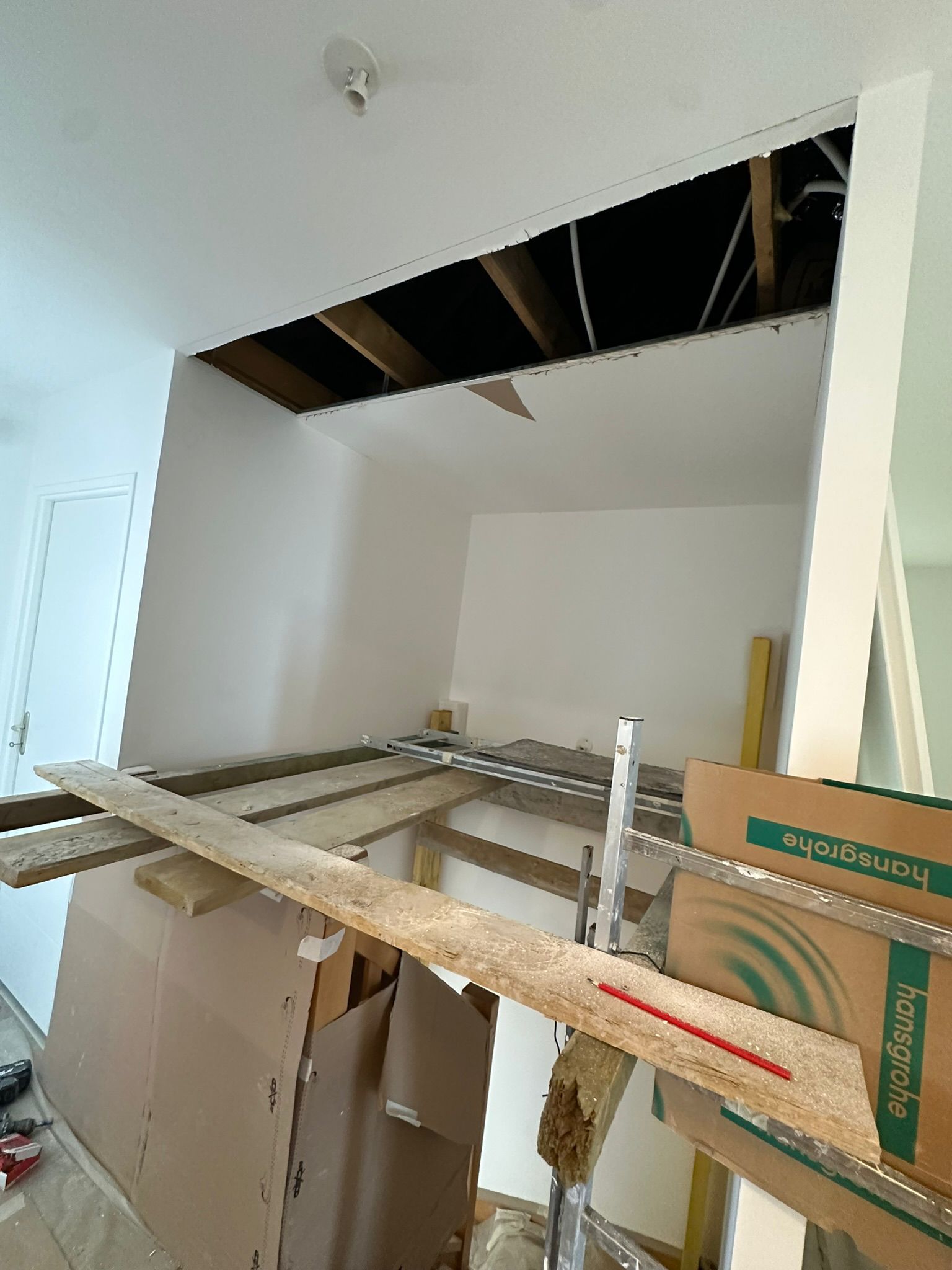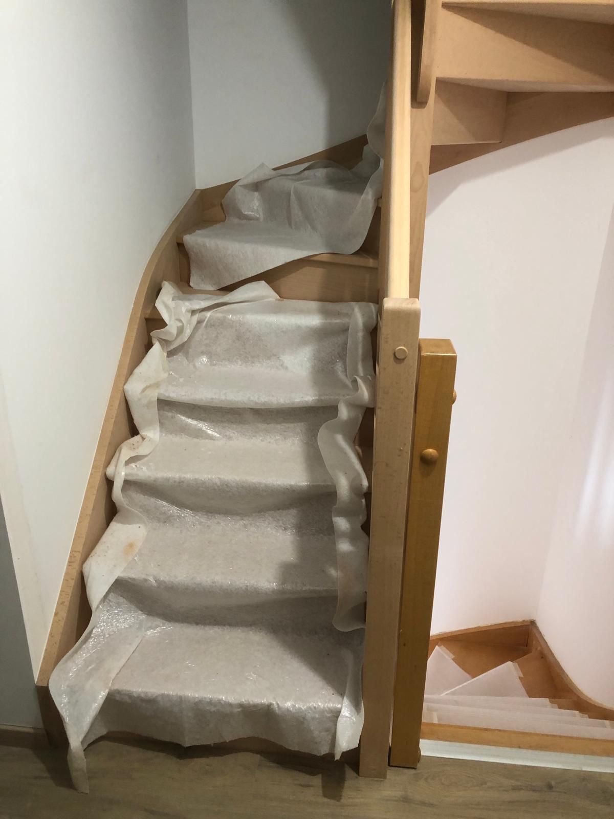 .Renforcement du plancher bas en charpente bois ,installation les fenêtres de toiture, création d'une trémie pour une d'escalier réalisé sur mesure, agencement en ba13 et isolation sous toiture laine de verre 200mm ISOVER, déplacement des pieuvres électriques et moteur vmc, ESCALIER SUR MESURE